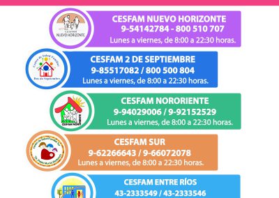 Como una manera de priorizar la atención y hacer una adecuada derivación de los consultantes a los distintos recintos de atención primaria, cada CESFAM dispondrá de 2 números telefónicos para sus usuarias y usuarios, los cuales funcionarán de lunes a viernes, de 8:00 a 22:30 horas. En el caso del CESFAM Rural Santa Fe será de lunes a jueves, de 8:00 a 17:00; y los viernes, de 8:00 a 16:00 horas.