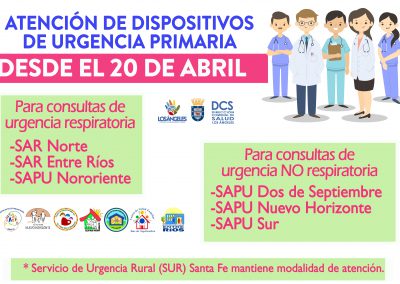 Este lunes 20 de abril la salud comunal de Los Ángeles estrenará, como “marcha blanca”, una nueva forma de atención en sus dispositivos de urgencia primaria -SAPU y SAR-, dividiendo totalmente la consulta respiratoria y la consulta no respiratoria para disminuir la posibilidad de contagio por COVID-19 o por otras patologías respiratorias entre la población que asiste a estos establecimientos de salud de la red municipal.