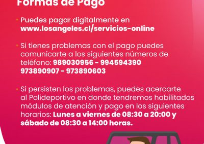 Los números habilitados para recibir las llamadas serán los celulares 989030956, 994594390, 973890907 y 973890603 los cuales estarán disponibles de lunes a viernes – 08:30 a 20:00 horas – para reforzar el pago del permiso de circulación el cual como todos los años se realizará de manera digital en la página web del municipio WWW.LOSANGELES.CL
