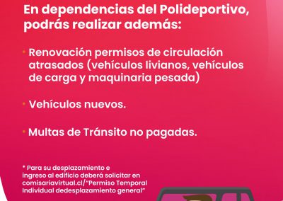 De manera paralela, se habilitarán también puntos de atención y cajas en dependencias del Polideportivo de lunes a viernes de 08:30 a 20:00 horas y los sábados de 08:30 a 14:00 horas, en donde además se podrá hacer la renovación de permisos de circulación atrasados (vehículos livianos, vehículos de carga y maquinaria pesada) y multas de Tránsito no pagadas.