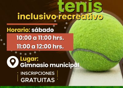 Del mismo modo, la Oficina de Recreación comenzará su taller de tenis inclusivo, el que se impartirá los días sábado de 10:00 a 11:00 de la mañana y de 11:00 a 12:00 horas en el Gimnasio Municipal. Para más información, pueden llamar al número 432 2408684.