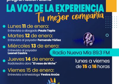 Recuerda de lunes a viernes de 15 a 16 horas por Radio Nueva Mía 89.5 FM, “La voz de la experiencia”, el programa radial para adultos mayores.